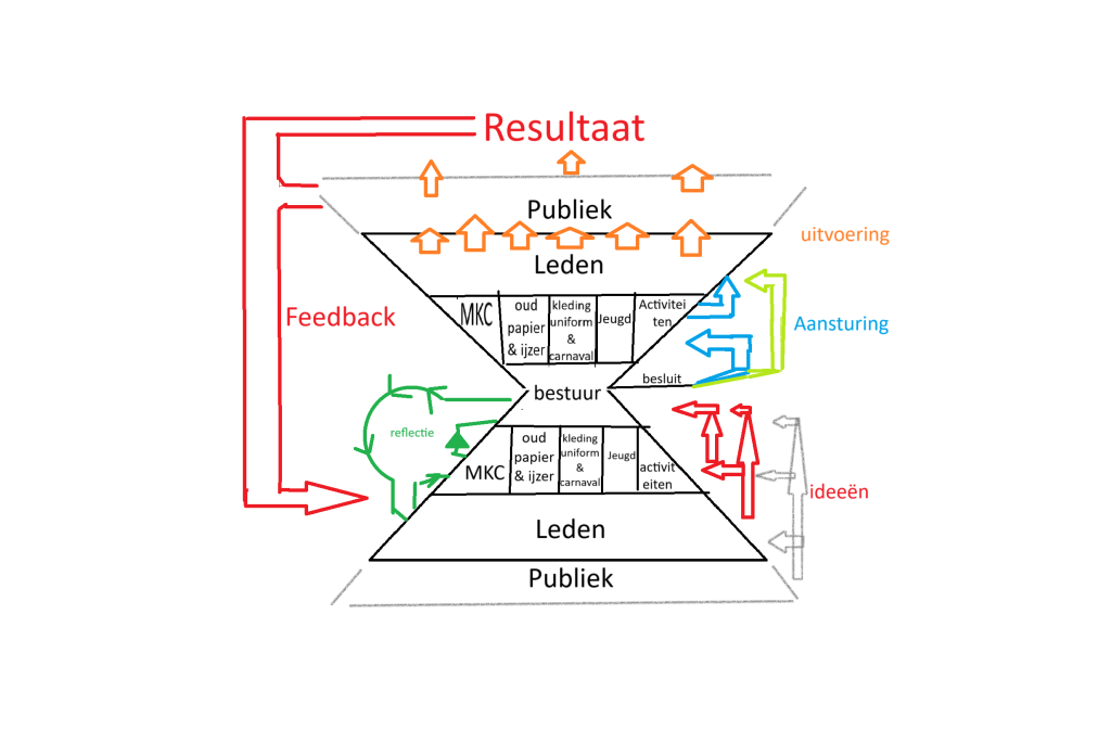 Een vereniging draait op leden, daarom ben jij zo belangrijk. Jouw ideeën maken ons tot wie we zijn. Het is dan ook belangrijk dat ideeën en vragen op de juiste plek terecht komen. Hiernaast zie je een afbeelding van hoe onze vereniging is opgebouwd. de Ideeën komen vanuit de onderkant en worden door gecommuniceerd en uitgedeeld naar de bovenkant. Zoals je ziet, begint en eindigt onze zandloper bij de leden, jullie zijn het contact met ons publiek, jullie dragen onze vereniging en jullie uitten onze activiteiten en onze trots door naar de buitenwereld. Ideeën of vragen? Wacht niet en gooi ze er uit!